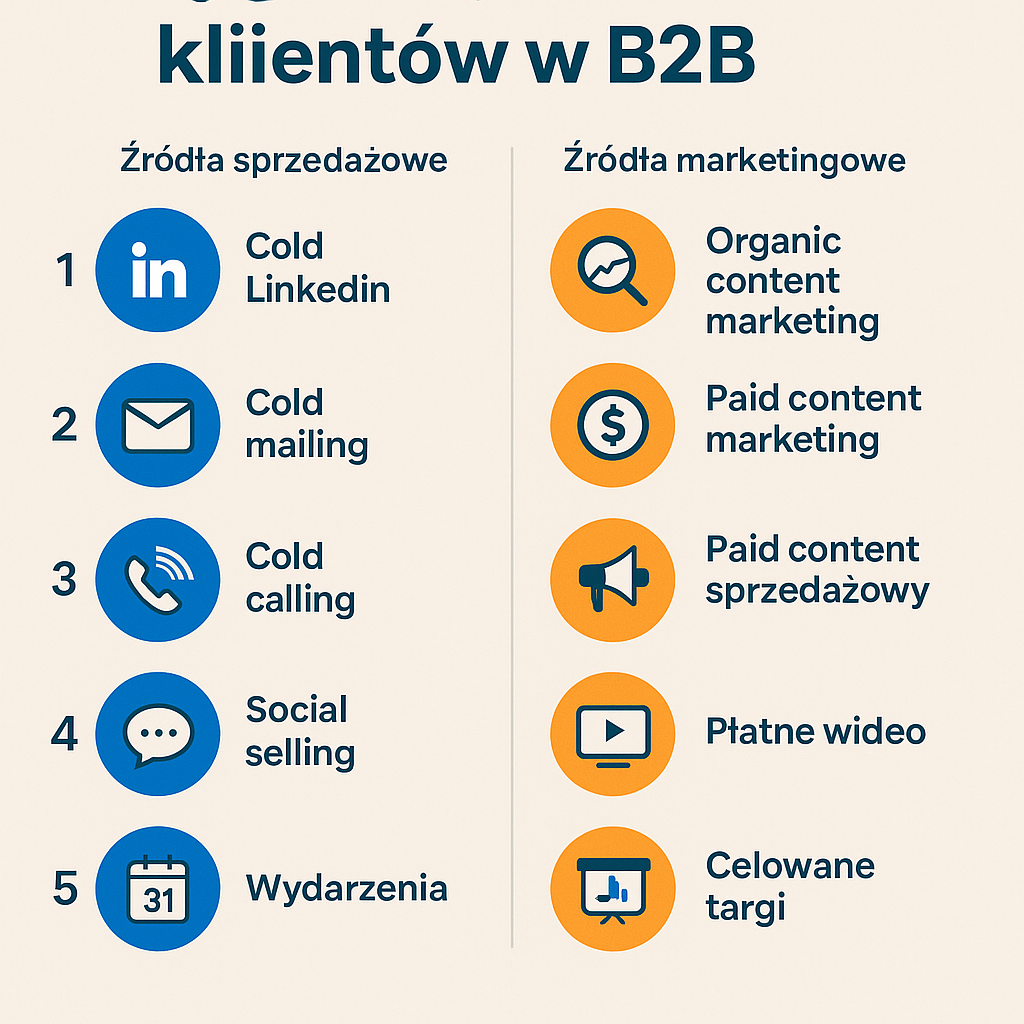 Dobrze opisany produkt lub usługa, przedstawiona graficznie i tekstowo, z odpowiednio przygotowanym call to action, w połączeniu z ruchem – to jest prawdziwa recepta na sukces. W tym artykule pokażemy Ci 10 najlepszych, sprawdzonych sposobów na pozyskiwanie klientów B2B. Podzielimy je na źródła sprzedażowe i marketingowe, ponieważ różnią się one znacznie pod względem narzędzi, zaangażowania i rezultatów.