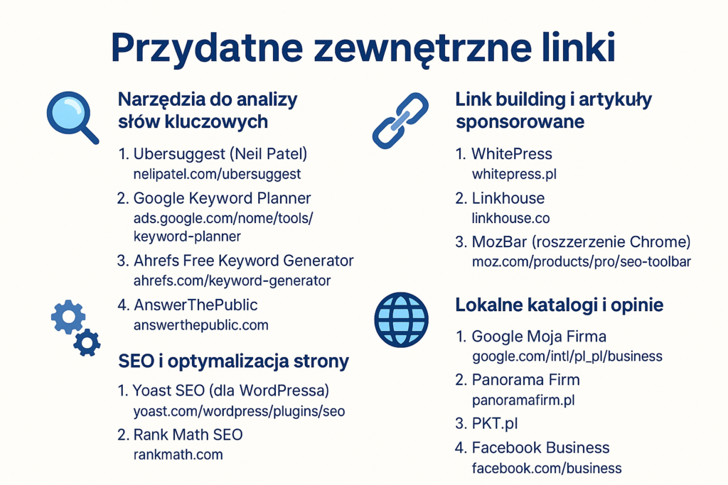 Linki to wciąż bardzo ważny sygnał dla algorytmów Google. Jednak nie chodzi tylko o ich ilość, ale jakość i kontekst. Dla biznesu lokalnego warto zdobywać linki z innych lokalnych stron – np. serwisów informacyjnych, lokalnych katalogów czy innych firm z regionu. Narzędzia jak MozBar (rozszerzenie do Chrome) pokażą tzw. Domain Authority strony, z której chcesz pozyskać link – najlepiej, jeśli ten wskaźnik wynosi minimum 20. Pomocne będą też platformy jak WhitePress czy Linkhouse, gdzie znajdziesz płatne opcje publikacji wartościowych artykułów z linkiem do Twojej strony.